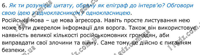 6. Як ти розумієш цитату, обрану як епіграф до інтерв’ю? Обговори свою ідею з однокласником / однокласницею. Російська мова – це мова агресора. Навіть просте листування нею може бути джерелом інформації для ворога. Також він використовує наявність великої кількості російськомовних громадян, аби виправдати свої злочини та війну. Саме тому це дійсно є питанням безпеки.