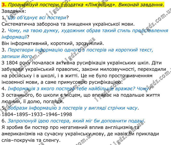 3. Проаналізуй постери з додатка «Лінгвоцид». Виконай завдання. Завдання: 1. Що об’єднує всі постери? Систематична заборона та знищення української мови. 2. Чому, на твою думку, художник обрав такий стиль представлення інформації? Він інформативний, короткий, зрозумілий. 3. Перетвори інформацію одного з постерів на короткий текст, запиши його. З 1804 року почалася активна русифікація українських шкіл. Діти забували український правопис, закони милозвучності, переходили на російську і в школі, і в житті. Це не було просто вивченням іноземної мови, а саме примусовою русифікацією. 4. Інформація з якого постера тебе найбільше вражає? Чому? З останнього, бо школи є місцем, що впливає на подальше життя людини, її долю, погляди. 5. Зобрази інформацію з постерів у вигляді стрічки часу. 1804–1895–1933–1946–1998 6. Запропонуй ідею постера, який міг би доповнити подані. Я зробив би постер про негативний вплив англіцизмів та американізмів на сучасну українську мову, де навів би приклади слів–покручів та сленгу.