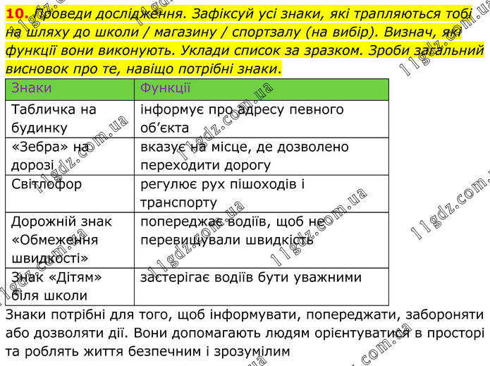 10. Проведи дослідження. Зафіксуй усі знаки, які трапляються тобі на шляху до школи / магазину / спортзалу (на вибір). Визнач, які функції вони виконують. Уклади список за зразком. Зроби загальний висновок про те, навіщо потрібні знаки. Знаки Функції Табличка на будинку інформує про адресу певного об’єкта «Зебра» на дорозі вказує на місце, де дозволено переходити дорогу Світлофор регулює рух пішоходів і транспорту Дорожній знак «Обмеження швидкості» попереджає водіїв, щоб не перевищували швидкість Знак «Дітям» біля школи застерігає водіїв бути уважними Знаки потрібні для того, щоб інформувати, попереджати, забороняти або дозволяти дії. Вони допомагають людям орієнтуватися в просторі та роблять життя безпечним і зрозумілим