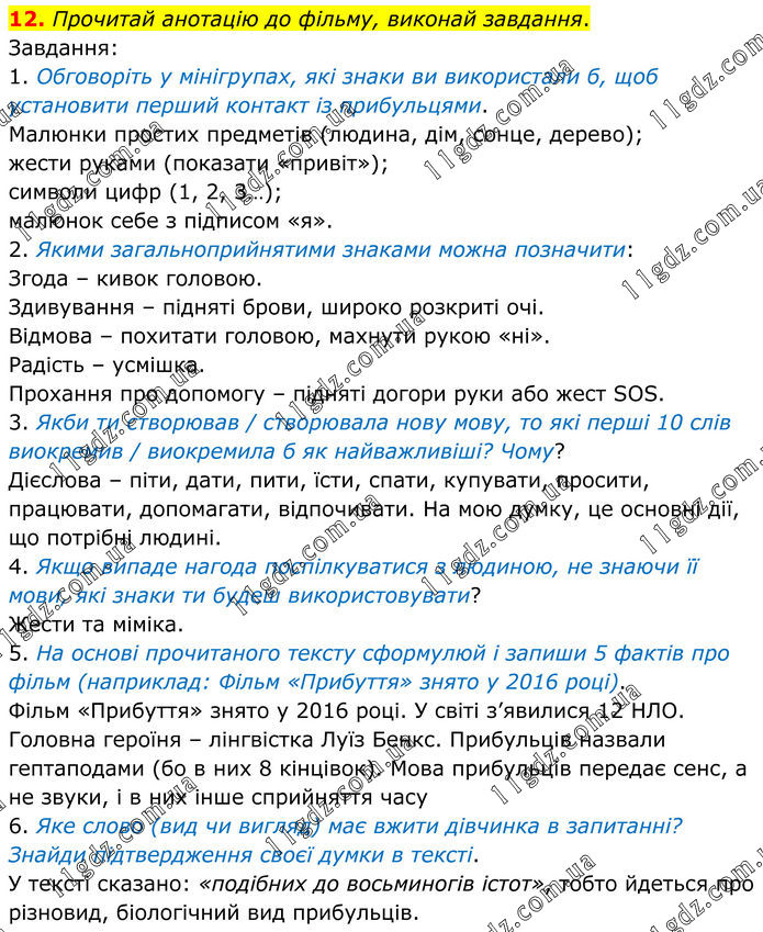 12. Прочитай анотацію до фільму, виконай завдання. Завдання: 1. Обговоріть у мінігрупах, які знаки ви використали б, щоб установити перший контакт із прибульцями. Малюнки простих предметів (людина, дім, сонце, дерево); жести руками (показати «привіт»); символи цифр (1, 2, 3…); малюнок себе з підписом «я». 2. Якими загальноприйнятими знаками можна позначити: Згода – кивок головою. Здивування – підняті брови, широко розкриті очі. Відмова – похитати головою, махнути рукою «ні». Радість – усмішка. Прохання про допомогу – підняті догори руки або жест SOS. 3. Якби ти створював / створювала нову мову, то які перші 10 слів виокремив / виокремила б як найважливіші? Чому? Дієслова – піти, дати, пити, їсти, спати, купувати, просити, працювати, допомагати, відпочивати. На мою думку, це основні дії, що потрібні людині. 4. Якщо випаде нагода поспілкуватися з людиною, не знаючи її мови, які знаки ти будеш використовувати? Жести та міміка. 5. На основі прочитаного тексту сформулюй і запиши 5 фактів про фільм (наприклад: Фільм «Прибуття» знято у 2016 році). Фільм «Прибуття» знято у 2016 році. У світі з’явилися 12 НЛО. Головна героїня – лінгвістка Луїз Бенкс. Прибульців назвали гептаподами (бо в них 8 кінцівок). Мова прибульців передає сенс, а не звуки, і в них інше сприйняття часу 6. Яке слово (вид чи вигляд) має вжити дівчинка в запитанні? Знайди підтвердження своєї думки в тексті. У тексті сказано: «подібних до восьминогів істот», тобто йдеться про різновид, біологічний вид прибульців.