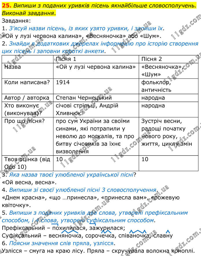 25. Випиши з поданих уривків пісень якнайбільше словосполучень. Виконай завдання. Завдання: 1. З’ясуй назви пісень, із яких узято уривки, і запиши їх. «Ой у лузі червона калина», «Весняночка» або «Шум». 2. Знайди в додаткових джерелах інформацію про історію створення цих пісень і заповни короткі анкети. Пісня 1 Пісня 2 Назва «Ой у лузі червона калина» «Весняночка», «Шум» Коли написана? 1914 фольклор, античність Автор / авторка Степан Чернецький народна Хто виконує (виконував)? січові стрільці, Андрій Хливнюк. народна Про що пісня? про сум України за своїми синами, які потрапили у неволю до москалів, та про битву січовиків за їхнє визволення Зустріч весни, радощі початку нового року, життя, циклу змін Твоя оцінка (від Одо 10) 10 10 3. Яка назва твоєї улюбленої української пісні? «Ой весна, весна». 4. Випиши зі своєї улюбленої пісні 3 словосполучення. «Днем красна», «що …принесла», «принесла вам», «рожевую квіточку». 5. Випиши з поданих уривків два слова, утворені префіксальним способом, і 4 слова, утворені суфіксальним способом. Префіксальний – похилилася, зажурилася; Суфіксальний – весняночка, сорочечка, співаночка, славну 6. Поясни значення слів пряла, узлісся. Узлісся – смуга на краю лісу. Пряла – скручувала волокна коноплі.