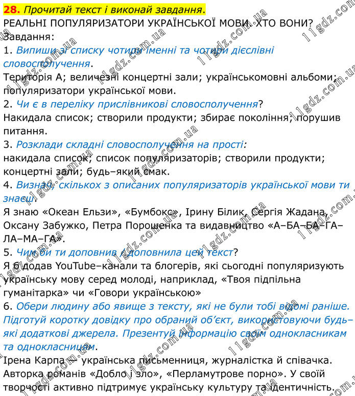 28. Прочитай текст і виконай завдання. РЕАЛЬНІ ПОПУЛЯРИЗАТОРИ УКРАЇНСЬКОЇ МОВИ. ХТО ВОНИ? Завдання: 1. Випиши зі списку чотири іменні та чотири дієслівні словосполучення. Територія А; величезні концертні зали; українськомовні альбоми; популяризатори української мови. 2. Чи є в переліку прислівникові словосполучення? Накидала список; створили продукти; збирає покоління; порушив питання. 3. Розклади складні словосполучення на прості: накидала список; список популяризаторів; створили продукти; концертні зали; будь–який смак. 4. Визнач, скількох з описаних популяризаторів української мови ти знаєш. Я знаю «Океан Ельзи», «Бумбокс», Ірину Білик, Сергія Жадана, Оксану Забужко, Петра Порошенка та видавництво «А–БА–БА–ГА–ЛА–МА–ГА». 5. Чим би ти доповнив / доповнила цей текст? Я б додав YouTube–канали та блогерів, які сьогодні популяризують українську мову серед молоді, наприклад, «Твоя підпільна гуманітарка» чи «Говори українською» 6. Обери людину або явище з тексту, які не були тобі відомі раніше. Підготуй коротку довідку про обраний об’єкт, використовуючи будь–які додаткові джерела. Презентуй інформацію своїм однокласникам та однокласницям. Ірена Карпа — українська письменниця, журналістка й співачка. Авторка романів «Добло і зло», «Перламутрове порно». У своїй творчості активно підтримує українську культуру та ідентичність.