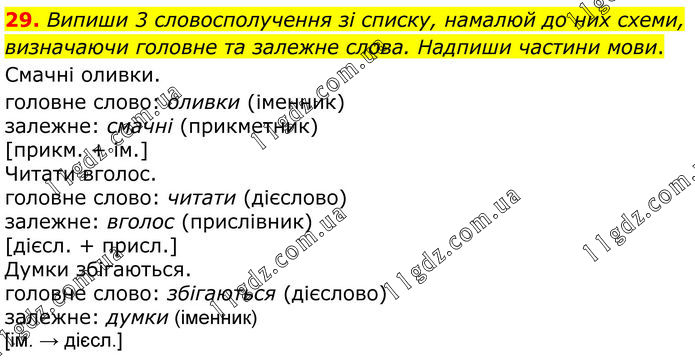 29. Випиши 3 словосполучення зі списку, намалюй до них схеми, визначаючи головне та залежне слова. Надпиши частини мови. Смачні оливки. головне слово: оливки (іменник) залежне: смачні (прикметник) [прикм. + ім.] Читати вголос. головне слово: читати (дієслово) залежне: вголос (прислівник) [дієсл. + присл.] Думки збігаються. головне слово: збігаються (дієслово) залежне: думки (іменник) [ім. → дієсл.]