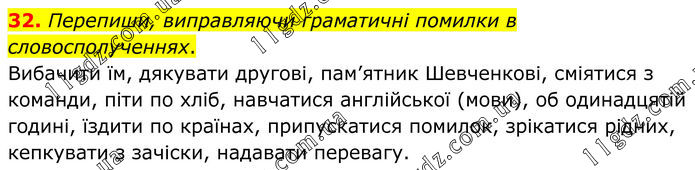 32. Перепиши, виправляючи граматичні помилки в словосполученнях. Вибачити їм, дякувати другові, пам’ятник Шевченкові, сміятися з команди, піти по хліб, навчатися англійської (мови), об одинадцятій годині, їздити по країнах, припускатися помилок, зрікатися рідних, кепкувати з зачіски, надавати перевагу.