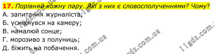 17. Порівняй кожну пару. Які з них є словосполученнями? Чому? А. запитання журналіста; Б. усміхнувся на камеру; В. намалюй сонце; Г. морозиво з полуниць; Д. біжить на побачення.