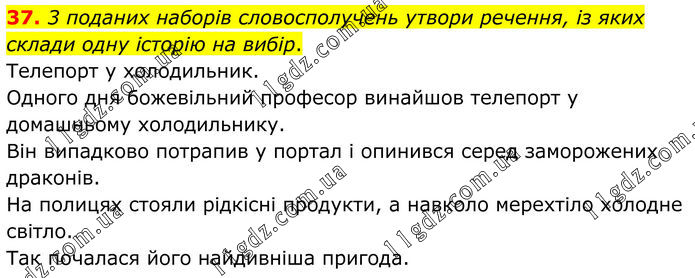 37. 3 поданих наборів словосполучень утвори речення, із яких склади одну історію на вибір. Телепорт у холодильник. Одного дня божевільний професор винайшов телепорт у домашньому холодильнику. Він випадково потрапив у портал і опинився серед заморожених драконів. На полицях стояли рідкісні продукти, а навколо мерехтіло холодне світло. Так почалася його найдивніша пригода.