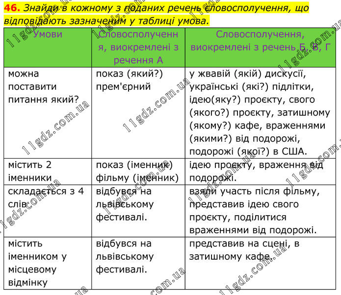 46. Знайди в кожному з поданих речень словосполучення, що відповідають зазначеним у таблиці умова. Умови Словосполучення, виокремлені з речення А Словосполучення, виокремлені з речень Б, В, Г можна поставити питання який? показ (який?) прем'єрний у жвавій (якій) дискусії, українські (які?) підлітки, ідею(яку?) проєкту, свого (якого?) проєкту, затишному (якому?) кафе, враженнями (якими?) від подорожі, подорожі (якої?) в США. містить 2 іменники показ (іменник) фільму (іменник) ідею проєкту, враження від подорожі. складається з 4 слів відбувся на львівському фестивалі. взяли участь після фільму, представив ідею свого проєкту, поділитися враженнями від подорожі. містить іменником у місцевому відмінку відбувся на львівському фестивалі. представив на сцені, в затишному кафе.