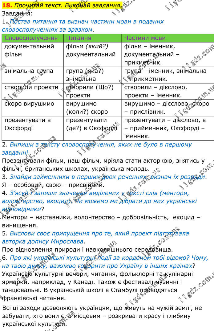 18. Прочитай текст. Виконай завдання. Завдання: 1. Постав питання та визнач частини мови в поданих словосполученнях за зразком. Словосполучення Питання Частини мови документальний фільм фільм (який?) документальний фільм – іменник, документальний – прикметник. знімальна група група (яка?) знімальна група – іменник, знімальна – прикметник. створили проекти створили (Що?) проекти створили – дієслово, проекти – іменник. скоро вирушимо вирушимо (коли?) скоро вирушимо – дієслово, скоро – прислівник. презентувати в Оксфорді презентувати (де?) в Оксфорді презентувати – дієслово, в – прийменник, Оксфорді – іменник. 2. Випиши з тексту словосполучення, яких не було в першому завданні. Презентували фільм, наш фільм, мріяла стати акторкою, знятись у фільмі, британських школах, українська молодь. 3. Знайди займенники в перших двох реченнях, визнач їх розряди. Я – особовий, свою – присвійний. 4. З’ясуй і запиши значення виділених у тексті слів (ментори, волонтерство, екоцид). Чи можемо ми дібрати до них українські відповідники? Ментори – наставники, волонтерство – добровільність, екоцид – винищення. 5. Вислови своє припущення про те, який проект підготувала авторка допису Мирослава. Про відновлення природи і навколишнього середовища. 6. Про які українські культурні події за кордоном тобі відомо? Чому, на твою думку, важливо говорити про Україну в інших країнах? Українські культурні вечори, читання, фольклорні та кулінарні ярмарки, наприклад, у Канаді. Також є фестивалі музичні і танцювальні. В українській школі в Стамбулі проводяться франківські читання. Всі ці заходи дозволяють українцям, що живуть на чужій землі, не забувати, хто вони є, а місцевим – розкривати красу і глибину української культури.