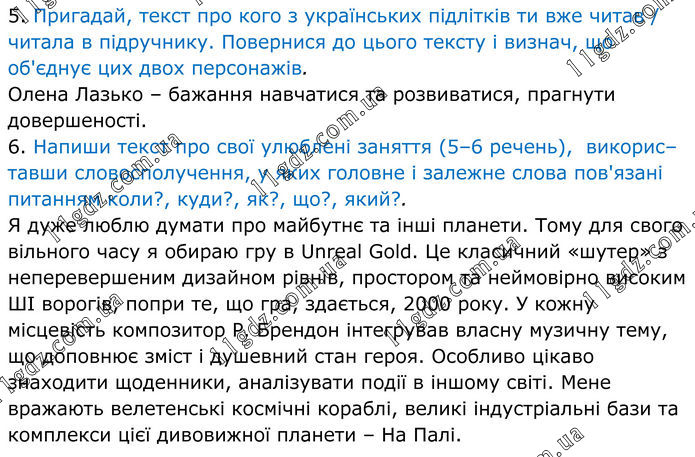 5. Пригадай, текст про кого з українських підлітків ти вже читав / читала в підручнику. Повернися до цього тексту і визнач, що об'єднує цих двох персонажів. Олена Лазько – бажання навчатися та розвиватися, прагнути довершеності. 6. Напиши текст про свої улюблені заняття (5–6 речень), викорис–тавши словосполучення, у яких головне і залежне слова пов'язані питанням коли?, куди?, як?, що?, який?. Я дуже люблю думати про майбутнє та інші планети. Тому для свого вільного часу я обираю гру в Unreal Gold. Це класичний «шутер» з неперевершеним дизайном рівнів, простором та неймовірно високим ШІ ворогів, попри те, що гра, здається, 2000 року. У кожну місцевість композитор Р. Брендон інтегрував власну музичну тему, що доповнює зміст і душевний стан героя. Особливо цікаво знаходити щоденники, аналізувати події в іншому світі. Мене вражають велетенські космічні кораблі, великі індустріальні бази та комплекси цієї дивовижної планети – На Палі.