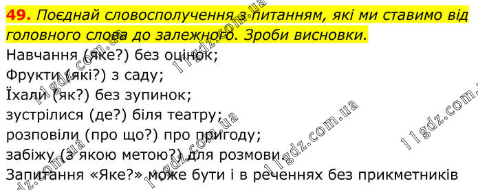 49. Поєднай словосполучення з питанням, які ми ставимо від головного слова до залежного. Зроби висновки. Навчання (яке?) без оцінок; Фрукти (які?) з саду; Їхали (як?) без зупинок; зустрілися (де?) біля театру; розповіли (про що?) про пригоду; забіжу (з якою метою?) для розмови. Запитання «Яке?» може бути і в реченнях без прикметників.