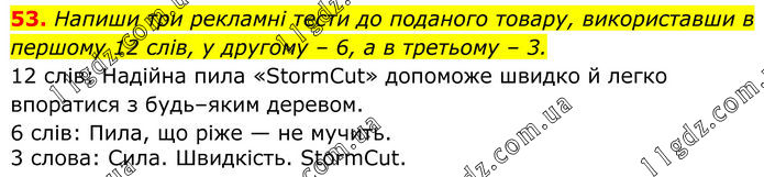 53. Напиши три рекламні тести до поданого товару, використавши в першому 12 слів, у другому – 6, а в третьому – 3. 12 слів: Надійна пила «StormCut» допоможе швидко й легко впоратися з будь–яким деревом. 6 слів: Пила, що ріже — не мучить. 3 слова: Сила. Швидкість. StormCut.