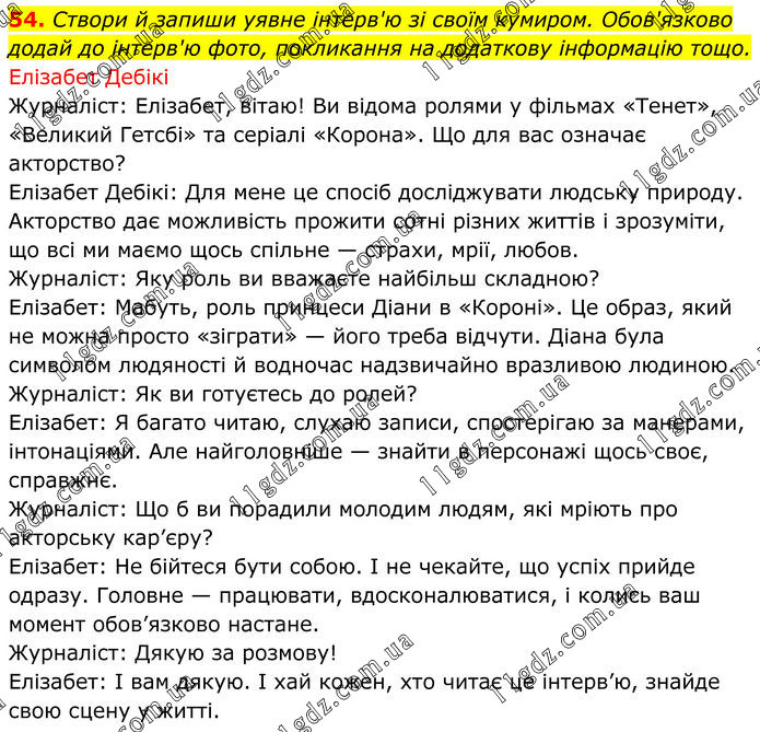 54. Створи й запиши уявне інтерв'ю зі своїм кумиром. Обов'язково додай до інтерв'ю фото, покликання на додаткову інформацію тощо. Елізабет Дебікі Журналіст: Елізабет, вітаю! Ви відома ролями у фільмах «Тенет», «Великий Гетсбі» та серіалі «Корона». Що для вас означає акторство? Елізабет Дебікі: Для мене це спосіб досліджувати людську природу. Акторство дає можливість прожити сотні різних життів і зрозуміти, що всі ми маємо щось спільне — страхи, мрії, любов. Журналіст: Яку роль ви вважаєте найбільш складною? Елізабет: Мабуть, роль принцеси Діани в «Короні». Це образ, який не можна просто «зіграти» — його треба відчути. Діана була символом людяності й водночас надзвичайно вразливою людиною. Журналіст: Як ви готуєтесь до ролей? Елізабет: Я багато читаю, слухаю записи, спостерігаю за манерами, інтонаціями. Але найголовніше — знайти в персонажі щось своє, справжнє. Журналіст: Що б ви порадили молодим людям, які мріють про акторську кар’єру? Елізабет: Не бійтеся бути собою. І не чекайте, що успіх прийде одразу. Головне — працювати, вдосконалюватися, і колись ваш момент обов’язково настане. Журналіст: Дякую за розмову! Елізабет: І вам дякую. І хай кожен, хто читає це інтерв’ю, знайде свою сцену у житті.