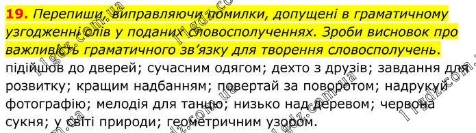 19. Перепиши, виправляючи помилки, допущені в граматичному узгодженні слів у поданих словосполученнях. Зроби висновок про важливість граматичного зв’язку для творення словосполучень. підійшов до дверей; сучасним одягом; дехто з друзів; завдання для розвитку; кращим надбанням; повертай за поворотом; надрукуй фотографію; мелодія для танцю; низько над деревом; червона сукня; у світі природи; геометричним узором.