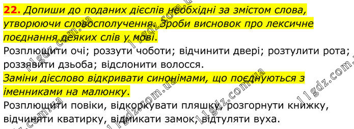 22. Допиши до поданих дієслів необхідні за змістом слова, утворюючи словосполучення. Зроби висновок про лексичне поєднання деяких слів у мові. Розплющити очі; роззути чоботи; відчинити двері; розтулити рота; роззявити дзьоба; відслонити волосся. Заміни дієслово відкривати синонімами, що поєднуються з іменниками на малюнку. Розплющити повіки, відкоркувати пляшку, розгорнути книжку, відчиняти кватирку, відмикати замок, відтуляти вуха.