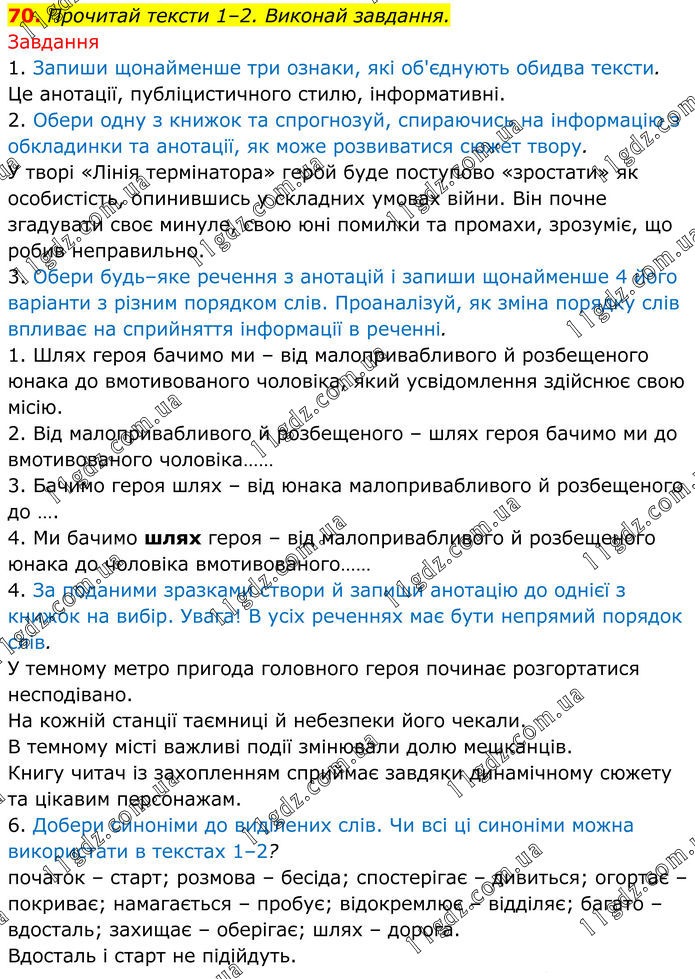 70. Прочитай тексти 1–2. Виконай завдання. Завдання 1. Запиши щонайменше три ознаки, які об'єднують обидва тексти. Це анотації, публіцистичного стилю, інформативні. 2. Обери одну з книжок та спрогнозуй, спираючись на інформацію з обкладинки та анотації, як може розвиватися сюжет твору. У творі «Лінія термінатора» герой буде поступово «зростати» як особистість, опинившись у складних умовах війни. Він почне згадувати своє минуле, свою юні помилки та промахи, зрозуміє, що робив неправильно. 3. Обери будь–яке речення з анотацій і запиши щонайменше 4 його варіанти з різним порядком слів. Проаналізуй, як зміна порядку слів впливає на сприйняття інформації в реченні. 1. Шлях героя бачимо ми – від малопривабливого й розбещеного юнака до вмотивованого чоловіка, який усвідомлення здійснює свою місію. 2. Від малопривабливого й розбещеного – шлях героя бачимо ми до вмотивованого чоловіка…… 3. Бачимо героя шлях – від юнака малопривабливого й розбещеного до …. 4. Ми бачимо шлях героя – від малопривабливого й розбещеного юнака до чоловіка вмотивованого…… 4. За поданими зразками створи й запиши анотацію до однієї з книжок на вибір. Увага! В усіх реченнях має бути непрямий порядок слів. У темному метро пригода головного героя починає розгортатися несподівано. На кожній станції таємниці й небезпеки його чекали. В темному місті важливі події змінювали долю мешканців. Книгу читач із захопленням сприймає завдяки динамічному сюжету та цікавим персонажам. 6. Добери синоніми до виділених слів. Чи всі ці синоніми можна використати в текстах 1–2? початок – старт; розмова – бесіда; спостерігає – дивиться; огортає – покриває; намагається – пробує; відокремлює – відділяє; багато – вдосталь; захищає – оберігає; шлях – дорога. Вдосталь і старт не підійдуть.
