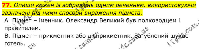 77. Опиши кожен із зображень одним реченням, використовуючи зазначені під ними способи вираження підмета. А Підмет – іменник. Олександр Великий був полководцем і правителем. В. Підмет – прикметник або дієприкметник. Загублений шукає готель.