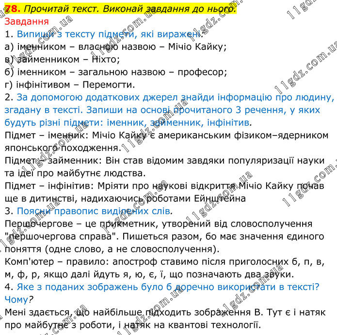 78. Прочитай текст. Виконай завдання до нього. Завдання 1. Випиши з тексту підмети, які виражені: а) іменником – власною назвою – Мічіо Кайку; в) займенником – Ніхто; б) іменником – загальною назвою – професор; г) інфінітивом – Перемогти. 2. За допомогою додаткових джерел знайди інформацію про людину, згадану в тексті. Запиши на основі прочитаного 3 речення, у яких будуть різні підмети: іменник, займенник, інфінітив. Підмет – іменник: Мічіо Кайку є американським фізиком–ядерником японського походження. Підмет – займенник: Він став відомим завдяки популяризації науки та ідеї про майбутнє людства. Підмет – інфінітив: Мріяти про наукові відкриття Мічіо Кайку почав ще в дитинстві, надихаючись роботами Ейнштейна 3. Поясни правопис виділених слів. Першочергове – це прикметник, утворений від словосполучення "першочергова справа". Пишеться разом, бо має значення єдиного поняття (одне слово, а не словосполучення). Комп'ютер – правило: апостроф ставимо після приголосних б, п, в, м, ф, р, якщо далі йдуть я, ю, є, ї, що позначають два звуки. 4. Яке з поданих зображень було б доречно використати в тексті? Чому? Мені здається, що найбільше підходить зображення В. Тут є і натяк про майбутнє з роботи, і натяк на квантові технології.