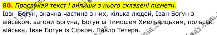 80. Прослухай текст і випиши з нього складені підмети. Іван Богун, значна частина з них, кілька людей, Іван Богун з військом, загони Богуна, Богун із Тимошем Хмельницьким, польські війська, Іван Богун із Сірком, Павло Тетеря.