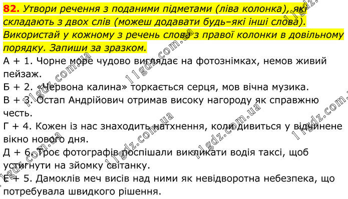 82. Утвори речення з поданими підметами (ліва колонка), які складають з двох слів (можеш додавати будь–які інші слова). Використай у кожному з речень слова з правої колонки в довільному порядку. Запиши за зразком. А + 1. Чорне море чудово виглядає на фотознімках, немов живий пейзаж. Б + 2. «Червона калина» торкається серця, мов вічна музика. В + 3. Остап Андрійович отримав високу нагороду як справжню честь. Г + 4. Кожен із нас знаходить натхнення, коли дивиться у відчинене вікно нового дня. Д + 6. Троє фотографів поспішали викликати водія таксі, щоб устигнути на зйомку світанку. Е + 5. Дамоклів меч висів над ними як невідворотна небезпека, що потребувала швидкого рішення.