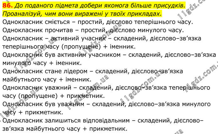 86. До поданого підмета добери якомога більше присудків. Проаналізуй, чим вони виражені у твоїх прикладах. Однокласник сміється – простий, дієслово теперішнього часу. Однокласник прочитав – простий, дієслово минулого часу. Однокласник – активний учасник – складений, дієслово–зв’язка теперішнього часу (пропущене) + іменник. Однокласник був активним учасником – складений, дієслово–зв’язка минулого часу + іменник. Однокласник стане лідером – складений, дієслово–зв’язка майбутнього часу + іменник. Однокласник уважний – складений, дієслово–зв’язка теперішнього часу (пропущене) + прикметник. Однокласник був уважним – складений, дієслово–зв’язка минулого часу + прикметник. Однокласник залишиться відповідальним – складений, дієслово–зв’язка майбутнього часу + прикметник.