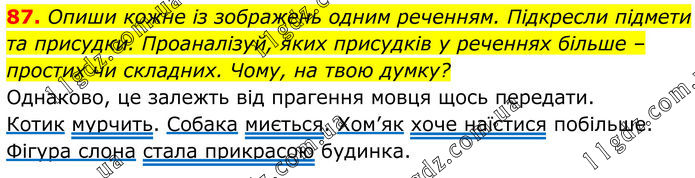 87. Опиши кожне із зображень одним реченням. Підкресли підмети та присудки. Проаналізуй, яких присудків у реченнях більше – простих чи складних. Чому, на твою думку? Однаково, це залежть від прагення мовця щось передати. Котик мурчить. Собака миється. Хом’як хоче наїстися побільше. Фігура слона стала прикрасою будинка.