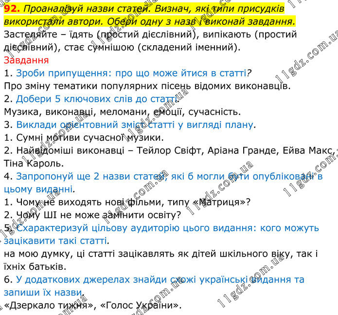 92. Проаналізуй назви статей. Визнач, які типи присудків використали автори. Обери одну з назв і виконай завдання. Застеляйте – їдять (простий дієслівний), випікають (простий дієслівний), стає сумнішою (складений іменний). Завдання 1. Зроби припущення: про що може йтися в статті? Про зміну тематики популярних пісень відомих виконавців. 2. Добери 5 ключових слів до статті. Музика, виконавці, меломани, емоції, сучасність. 3. Виклади орієнтовний зміст статті у вигляді плану. 1. Сумні мотиви сучасної музики. 2. Найвідоміші виконавці – Тейлор Свіфт, Аріана Гранде, Ейва Макс, Тіна Кароль. 4. Запропонуй ще 2 назви статей, які б могли бути опубліковані в цьому виданні. 1. Чому не виходять нові фільми, типу «Матриця»? 2. Чому ШІ не може замінити освіту? 5. Схарактеризуй цільову аудиторію цього видання: кого можуть зацікавити такі статті. на мою думку, ці статті зацікавлять як дітей шкільного віку, так і їхніх батьків. 6. У додаткових джерелах знайди схожі українські видання та запиши їх назви. «Дзеркало тижня», «Голос України».