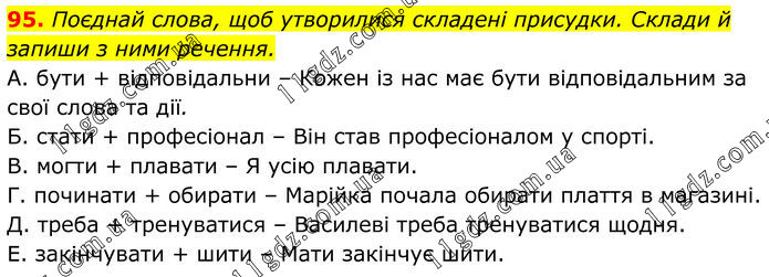 95. Поєднай слова, щоб утворилися складені присудки. Склади й запиши з ними речення. А. бути + відповідальни – Кожен із нас має бути відповідальним за свої слова та дії. Б. стати + професіонал – Він став професіоналом у спорті. В. могти + плавати – Я усію плавати. Г. починати + обирати – Марійка почала обирати плаття в магазині. Д. треба + тренуватися – Василеві треба тренуватися щодня. Е. закінчувати + шити – Мати закінчує шити.