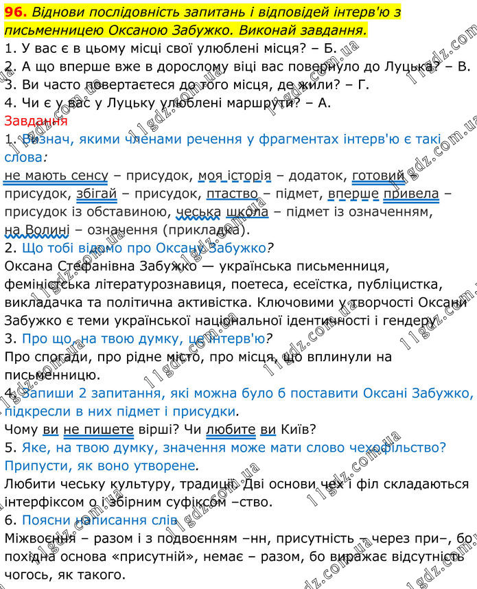 96. Віднови послідовність запитань і відповідей інтерв'ю з письменницею Оксаною Забужко. Виконай завдання. 1. У вас є в цьому місці свої улюблені місця? – Б. 2. А що вперше вже в дорослому віці вас повернуло до Луцька? – В. 3. Ви часто повертаєтеся до того місця, де жили? – Г. 4. Чи є у вас у Луцьку улюблені маршрути? – А. Завдання 1. Визнач, якими членами речення у фрагментах інтерв'ю є такі слова: не мають сенсу – присудок, моя історія – додаток, готовий – присудок, збігай – присудок, птаство – підмет, вперше привела – присудок із обставиною, чеська школа – підмет із означенням, на Волині – означення (прикладка). 2. Що тобі відомо про Оксану Забужко? Оксана Стефанівна Забужко — українська письменниця, феміністська літературознавиця, поетеса, есеїстка, публіцистка, викладачка та політична активістка. Ключовими у творчості Оксани Забужко є теми української національної ідентичності і гендеру 3. Про що, на твою думку, це інтерв'ю? Про спогади, про рідне місто, про місця, що вплинули на письменницю. 4. Запиши 2 запитання, які можна було б поставити Оксані Забужко, підкресли в них підмет і присудки. Чому ви не пишете вірші? Чи любите ви Київ? 5. Яке, на твою думку, значення може мати слово чехофільство? Припусти, як воно утворене. Любити чеську культуру, традиції. Дві основи чех і філ складаються інтерфіксом о і збірним суфіксом –ство. 6. Поясни написання слів Міжвоєння – разом і з подвоєнням –нн, присутність – через при–, бо похідна основа «присутній», немає – разом, бо виражає відсутність чогось, як такого.