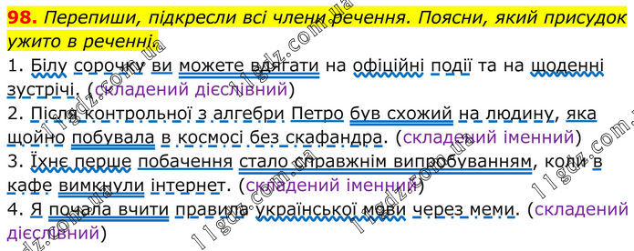 98. Перепиши, підкресли всі члени речення. Поясни, який присудок ужито в реченні. 1. Білу сорочку ви можете вдягати на офіційні події та на щоденні зустрічі. (складений дієслівний) 2. Після контрольної з алгебри Петро був схожий на людину, яка щойно побувала в космосі без скафандра. (складений іменний) 3. Їхнє перше побачення стало справжнім випробуванням, коли в кафе вимкнули інтернет. (складений іменний) 4. Я почала вчити правила української мови через меми. (складений дієслівний)