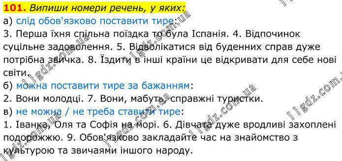 101. Випиши номери речень, у яких: а) слід обов'язково поставити тире: 3. Перша їхня спільна поїздка то була Іспанія. 4. Відпочинок суцільне задоволення. 5. Відволікатися від буденних справ дуже потрібна звичка. 8. Їздити в інші країни це відкривати для себе нові світи. б) можна поставити тире за бажанням: 2. Вони молодці. 7. Вони, мабуть, справжні туристки. в) не можна / не треба ставити тире: 1. Іванка, Оля та Софія на морі. 6. Дівчата дуже вродливі захоплені подорожжю. 9. Обов'язково закладайте час на знайомство з культурою та звичаями іншого народу.
