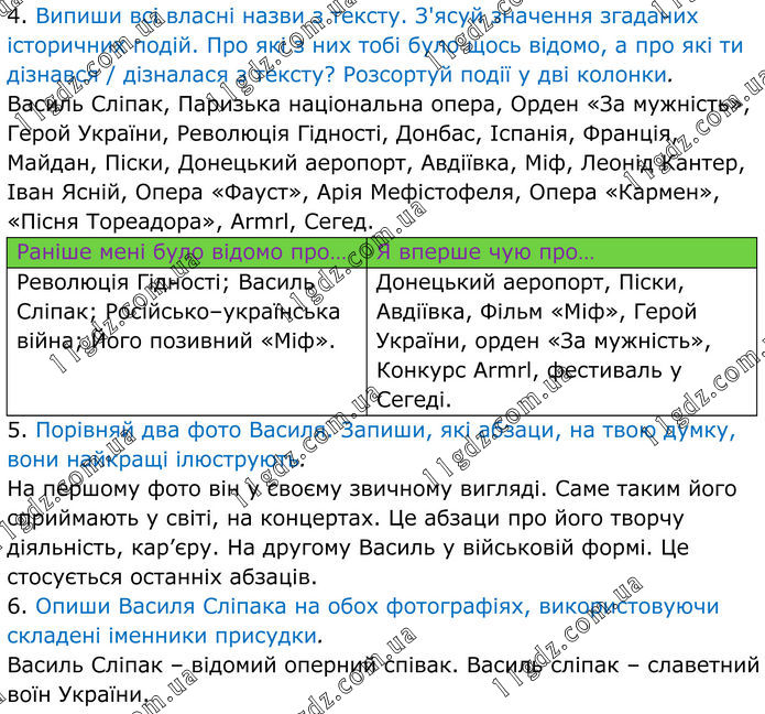 4. Випиши всі власні назви з тексту. З'ясуй значення згаданих історичних подій. Про які з них тобі було щось відомо, а про які ти дізнався / дізналася з тексту? Розсортуй події у дві колонки. Василь Сліпак, Паризька національна опера, Орден «За мужність», Герой України, Революція Гідності, Донбас, Іспанія, Франція, Майдан, Піски, Донецький аеропорт, Авдіївка, Міф, Леонід Кантер, Іван Ясній, Опера «Фауст», Арія Мефістофеля, Опера «Кармен», «Пісня Тореадора», Armrl, Сегед. Раніше мені було відомо про… Я вперше чую про… Революція Гідності; Василь Сліпак; Російсько–українська війна; Його позивний «Міф». Донецький аеропорт, Піски, Авдіївка, Фільм «Міф», Герой України, орден «За мужність», Конкурс Armrl, фестиваль у Сегеді. 5. Порівняй два фото Василя. Запиши, які абзаци, на твою думку, вони найкращі ілюструють. На першому фото він у своєму звичному вигляді. Саме таким його сприймають у світі, на концертах. Це абзаци про його творчу діяльність, кар’єру. На другому Василь у військовій формі. Це стосується останніх абзаців. 6. Опиши Василя Сліпака на обох фотографіях, використовуючи складені іменники присудки. Василь Сліпак – відомий оперний співак. Василь сліпак – славетний воїн України.