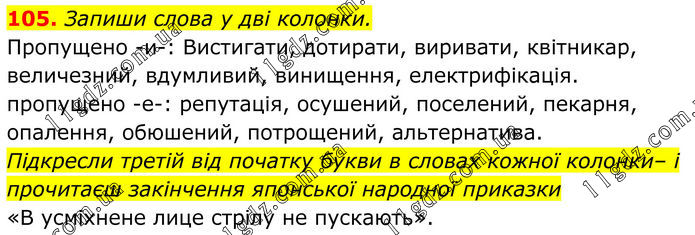 105. Запиши слова у дві колонки. Пропущено -и-: Вистигати, дотирати, виривати, квітникар, величезний, вдумливий, винищення, електрифікація. пропущено -е-: репутація, осушений, поселений, пекарня, опалення, обюшений, потрощений, альтернатива. Підкресли третій від початку букви в словах кожної колонки– і прочитаєш закінчення японської народної приказки «В усміхнене лице стрілу не пускають».