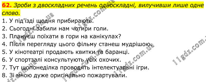 62. Зроби з двоскладних речень односкладні, вилучивши лише одне слово. 1. У під'їзді щодня прибирають. 2. Сьогодні забили нам чотири голи. 3. Плануєш поїхати в гори на канікулах? 4. Після перегляду цього фільму станеш мудрішою. 5. У кінотеатрі продають квитки та баранці. 6. У спортзалі консультують усіх охочих. 7. Тут щопонеділка проводять інтелектуальні ігри. 8. Зі мною дуже оригінально пожартували.