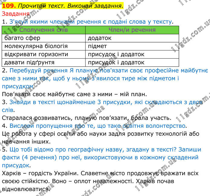 109. Прочитай текст. Виконай завдання. Завдання 1. З'ясуй якими членами речення є подані слова у тексту. Сполучення слів Член/и речення багато сфер додаток молекулярна біологія підмет відкривати горизонти присудок і додаток давати підґрунтя присудок і додаток 2. Перебудуй речення Я планую пов'язати своє професійне майбутнє саме з ними так, щоб у ньому з'явилося тире між підметом і присудком. Пов’язати своє майбутнє саме з ними – мій план. 3. Знайди в тексті щонайменше 3 присудки, які складаються з двох слів. Старалася розвиватись, планую пов’язати, брала участь. 4. Вислови пропущення про те, що таке освітня волонтерство. Це робота у сфері освіти або науки задля розвитку технологій або навчання інших. 5. Що тобі відомо про географічну назву, згадану в тексті? Запиши факти (4 речення) про неї, використовуючи в кожному складений присудок. Харків – гордість України. Славетне місто продовжує вражати всіх своєю стійкістю. Воно – оплот незалежності. Харків почав відновлюватися.