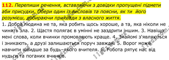 112. Перепиши речення, вставляючи з довідки пропущені підмети аби присудки. Обери один із висловів та поясни, як ти його розумієш, добираючи приклади з власного життя. 1. Добра людина не та, яка робить щось хороше, а та, яка ніколи не чинить зла. 2. Щастя полягає в умінні не заздрити іншим. 3. Навіщо мені слова, коли вчинки промовляють краще. 4. Знайомі з'являються і зникають, а друзі залишаються поруч завжди. 5. Ворог може навчити швидше за будь–якого вчителя. 6. Робота рятує нас від нудьги та поганих вчинків.