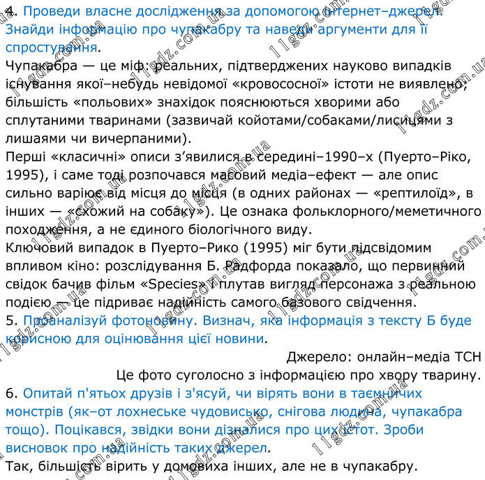 4. Проведи власне дослідження за допомогою інтернет–джерел. Знайди інформацію про чупакабру та наведи аргументи для її спростування. Чупакабра — це міф: реальних, підтверджених науково випадків існування якої–небудь невідомої «кровососної» істоти не виявлено; більшість «польових» знахідок пояснюються хворими або сплутаними тваринами (зазвичай койотами/собаками/лисицями з лишаями чи вичерпаними). Перші «класичні» описи з’явилися в середині–1990–х (Пуерто–Ріко, 1995), і саме тоді розпочався масовий медіа–ефект — але опис сильно варіює від місця до місця (в одних районах — «рептилоїд», в інших — «схожий на собаку»). Це ознака фольклорного/меметичного походження, а не єдиного біологічного виду. Ключовий випадок в Пуерто–Рико (1995) міг бути підсвідомим впливом кіно: розслідування Б. Радфорда показало, що первинний свідок бачив фільм «Species» і плутав вигляд персонажа з реальною подією — це підриває надійність самого базового свідчення. 5. Проаналізуй фотоновину. Визнач, яка інформація з тексту Б буде корисною для оцінювання цієї новини. Джерело: онлайн–медіа ТСН Це фото суголосно з інформацією про хвору тварину. 6. Опитай п'ятьох друзів і з'ясуй, чи вірять вони в таємничих монстрів (як–от лохнеське чудовисько, снігова людина, чупакабра тощо). Поцікався, звідки вони дізналися про цих істот. Зроби висновок про надійність таких джерел. Так, більшість вірить у домовиха інших, але не в чупакабру.
