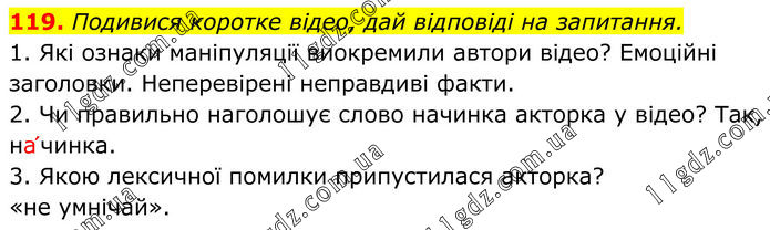 119. Подивися коротке відео, дай відповіді на запитання. 1. Які ознаки маніпуляції виокремили автори відео? Емоційні заголовки. Неперевірені неправдиві факти. 2. Чи правильно наголошує слово начинка акторка у відео? Так, на՛чинка. 3. Якою лексичної помилки припустилася акторка? «не умнічай».