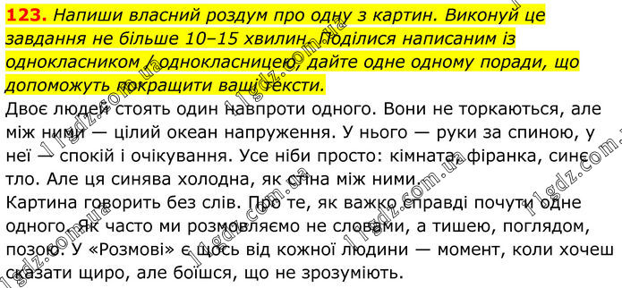 123. Напиши власний роздум про одну з картин. Виконуй це завдання не більше 10–15 хвилин. Поділися написаним із однокласником / однокласницею, дайте одне одному поради, що допоможуть покращити ваші тексти. Двоє людей стоять один навпроти одного. Вони не торкаються, але між ними — цілий океан напруження. У нього — руки за спиною, у неї — спокій і очікування. Усе ніби просто: кімната, фіранка, синє тло. Але ця синява холодна, як стіна між ними. Картина говорить без слів. Про те, як важко справді почути одне одного. Як часто ми розмовляємо не словами, а тишею, поглядом, позою. У «Розмові» є щось від кожної людини — момент, коли хочеш сказати щиро, але боїшся, що не зрозуміють.