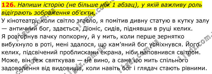126. Напиши історію (не більше ніж 1 абзац), у якій важливу роль відіграють зображення об'єкти. У кінотеатрі, коли світло згасло, я помітив дивну статую в кутку залу — античний бог, здається, Діоніс, сидів, піднявши в руці келих. Я розгорнув пачку попкорну, й у мить, коли перше зернятко вибухнуло в роті, мені здалося, що кам’яний бог усміхнувся. Його келих, підсвічений проблисками екрана, ніби наповнився світлом. Може, він теж святкував — не вино, а саме цю мить спільного задоволення від видовища, коли навіть бог і глядач стають рівними.