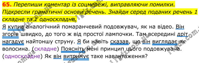 65. Перепиши коментар із соцмережі, виправляючи помилки. Підкресли граматичні основи речень. Знайди серед поданих речень 1 складне та 1 односкладне. Я купив аналогічний помаранчевий подовжувач, як на відео. Він згорів швидко, до того ж від простої лампочки. Там всередині дріт нагадує найтоншу струну. Я би навіть сказав, що він виглядає як волосина. (складне) Поясніть мені принцип цього подовжувача. (односкладне) Як він витримує таке навантаження?