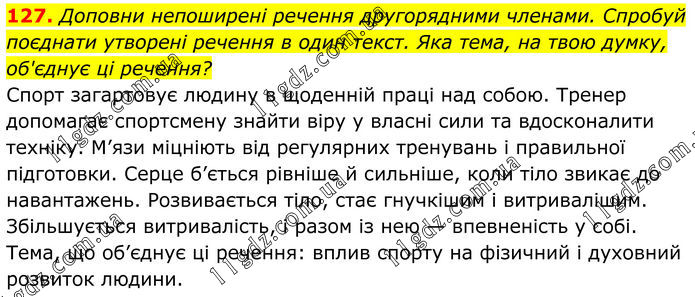 127. Доповни непоширені речення другорядними членами. Спробуй поєднати утворені речення в один текст. Яка тема, на твою думку, об'єднує ці речення? Спорт загартовує людину в щоденній праці над собою. Тренер допомагає спортсмену знайти віру у власні сили та вдосконалити техніку. М’язи міцніють від регулярних тренувань і правильної підготовки. Серце б’ється рівніше й сильніше, коли тіло звикає до навантажень. Розвивається тіло, стає гнучкішим і витривалішим. Збільшується витривалість, і разом із нею — впевненість у собі. Тема, що об’єднує ці речення: вплив спорту на фізичний і духовний розвиток людини.
