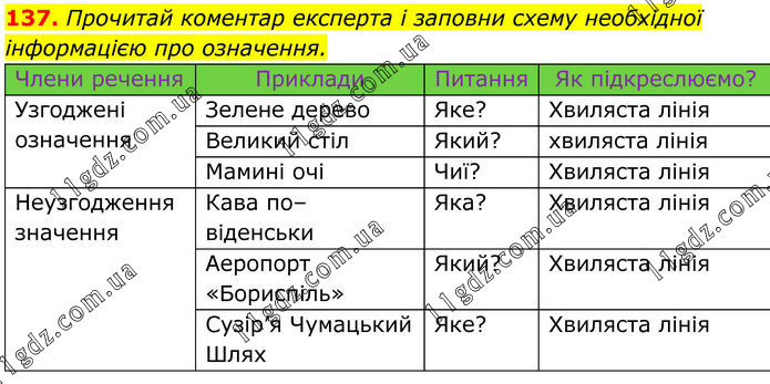 137. Прочитай коментар експерта і заповни схему необхідної інформацією про означення. Члени речення Приклади Питання Як підкреслюємо? Узгоджені означення Зелене дерево Яке? Хвиляста лінія Великий стіл Який? хвиляста лінія Мамині очі Чиї? Хвиляста лінія Неузгодження значення Кава по–віденськи Яка? Хвиляста лінія Аеропорт «Бориспіль» Який? Хвиляста лінія Сузір’я Чумацький Шлях Яке? Хвиляста лінія