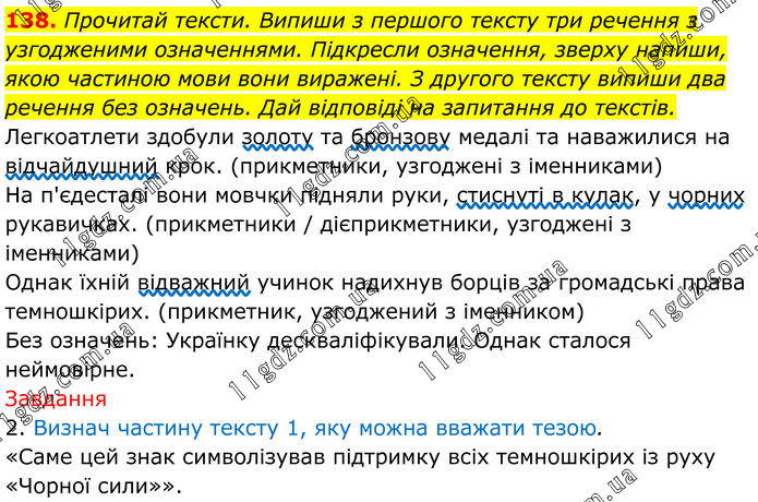 138. Прочитай тексти. Випиши з першого тексту три речення з узгодженими означеннями. Підкресли означення, зверху напиши, якою частиною мови вони виражені. З другого тексту випиши два речення без означень. Дай відповіді на запитання до текстів. Легкоатлети здобули золоту та бронзову медалі та наважилися на відчайдушний крок. (прикметники, узгоджені з іменниками) На п'єдесталі вони мовчки підняли руки, стиснуті в кулак, у чорних рукавичках. (прикметники / дієприкметники, узгоджені з іменниками) Однак їхній відважний учинок надихнув борців за громадські права темношкірих. (прикметник, узгоджений з іменником) Без означень: Українку дескваліфікували. Однак сталося неймовірне. Завдання 2. Визнач частину тексту 1, яку можна вважати тезою. «Саме цей знак символізував підтримку всіх темношкірих із руху «Чорної сили»».