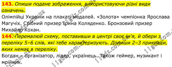 143. Опиши подане зображення, використовуючи різні види означень. Олімпійці України на плакаті медалей. «Золота» чемпіонка Ярослава Магучіх. Срібний призер Ірина Коляденко. Бронзовий призер Михайло Кохан. 144. Перемалюй схему, поставивши в центрі своє ім'я, й обери з переліку 5–6 слів, які тебе характеризують. Допиши 2–3 приклади, яких немає в переліку. Богдан – організатор, лідер, українець. Також геймер, музикант і мрійник.