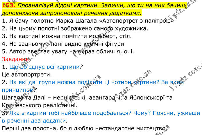 153. Проаналізуй відомі картини. Запиши, що ти на них бачиш, доповнюючи запропоновані речення додатками. 1. Я бачу полотно Марка Шагала «Автопортрет з палітрою» 2. На цьому полотні зображено самого художника. 3. На картині можна помітити мольберт, стіл. 4. На задньому плані видно кубічні фігури 5. Автор звертає увагу на вираз обличчя, очі. Завдання 1. Що об'єднує всі картини? Це автопортрети. 2. На які дві групи можна поділити ці чотири картини? За яким принципом? Шагала та Далі – мерністські, авангардні, а Яблонськорї та Кричевського реалістичні. 3. Яка з картин тобі найбільше подобається? Чому? Поясни, уживши в реченні два додатки. Перші два полотна, бо я люблю нестандартне мистецтво.
