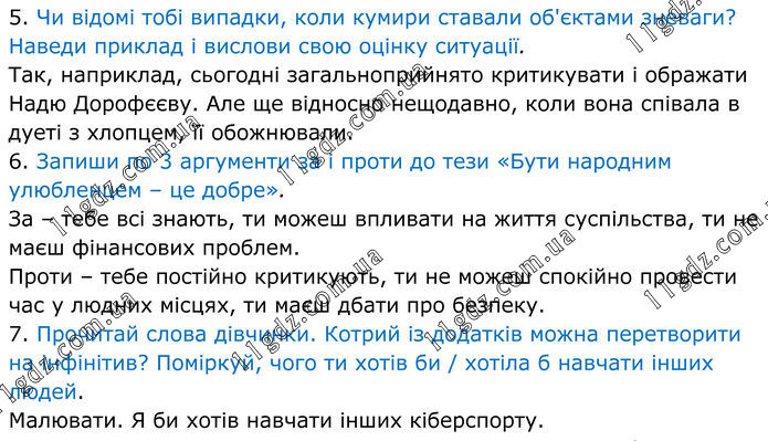 5. Чи відомі тобі випадки, коли кумири ставали об'єктами зневаги? Наведи приклад і вислови свою оцінку ситуації. Так, наприклад, сьогодні загальноприйнято критикувати і ображати Надю Дорофєєву. Але ще відносно нещодавно, коли вона співала в дуеті з хлопцем, її обожнювали. 6. Запиши по 3 аргументи за і проти до тези «Бути народним улюбленцем – це добре». За – тебе всі знають, ти можеш впливати на життя суспільства, ти не маєш фінансових проблем. Проти – тебе постійно критикують, ти не можеш спокійно провести час у людних місцях, ти маєш дбати про безпеку. 7. Прочитай слова дівчинки. Котрий із додатків можна перетворити на інфінітив? Поміркуй, чого ти хотів би / хотіла б навчати інших людей. Малювати. Я би хотів навчати інших кіберспорту.