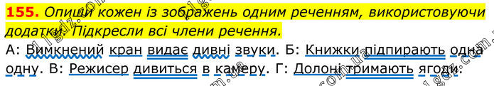155. Опиши кожен із зображень одним реченням, використовуючи додатки. Підкресли всі члени речення. А: Вимкнений кран видає дивні звуки. Б: Книжки підпирають одна одну. В: Режисер дивиться в камеру. Г: Долоні тримають ягоди.