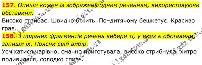 157. Опиши кожен із зображень одним реченням, використовуючи обставини. Високо стрибає. Швидко біжить. По–дитячому бешкетує. Красиво грає. 158. З поданих фрагментів речень вибери ті, у яких є обставини, запиши їх. Поясни свій вибір. Усміхатися чарівно, смачно приготувала, високо стрибнула, хитро подивилася, солодко спить.