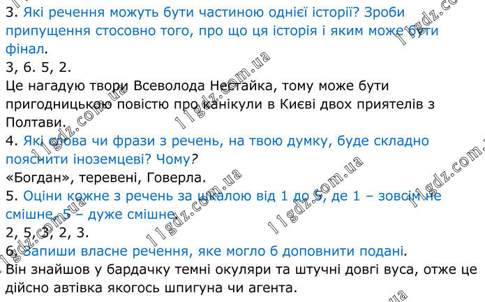 3. Які речення можуть бути частиною однієї історії? Зроби припущення стосовно того, про що ця історія і яким може бути фінал. 3, 6. 5, 2. Це нагадую твори Всеволода Нестайка, тому може бути пригодницькою повістю про канікули в Києві двох приятелів з Полтави. 4. Які слова чи фрази з речень, на твою думку, буде складно пояснити іноземцеві? Чому? «Богдан», теревені, Говерла. 5. Оціни кожне з речень за шкалою від 1 до 5, де 1 – зовсім не смішне, 5 – дуже смішне. 2, 5, 3, 2, 3. 6. Запиши власне речення, яке могло б доповнити подані. Він знайшов у бардачку темні окуляри та штучні довгі вуса, отже це дійсно автівка якогось шпигуна чи агента.