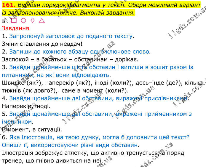 161. Віднови порядок фрагментів у тексті. Обери можливий варіант із запропонованих нижче. Виконай завдання. Завдання 1. Запропонуй заголовок до поданого тексту. Зміни ставлення до невдач! 2. Запиши до кожного абзацу одне ключове слово. Заспокой – в багатьох – обставинам – дорікає. 3. Знайди щонайменше шість обставин і випиши в зошит разом із питаннями, на які вони відповідають. Швидко (як?), наперекір (як?), іноді (коли?), десь–інде (де?), кілька тижнів (як довго?), саме в момент (коли?). 4. Знайди щонайменше дві обставини, виражені прислівниками. Наперекір, іноді. 5. Знайди щонайменше дві обставини, виражені прийменником з іменником. В момент, в ситуації. 6. Яка ілюстрація, на твою думку, могла б доповнити цей текст? Опиши її, використовуючи різні види обставин. Ілюстрація зображує атлетку, що активно тренується, а поряд тренер, що гнівно дивиться на неї.